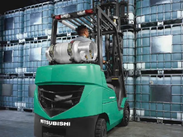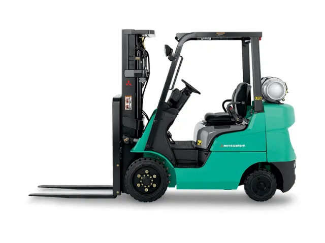 Montacargas de combustión Mitsubishi FGC15N-FGC33N, ideales para realizar operaciones de traslado de productos en exteriores e interiores, en pisos estables e inestables. Ofrecen una capacidad de carga de hasta 3,300 kg, con horquillas que pueden alcanzar los 2,485 mm de longitud, y un motor de combustión a gas LP.