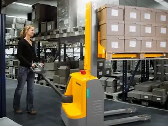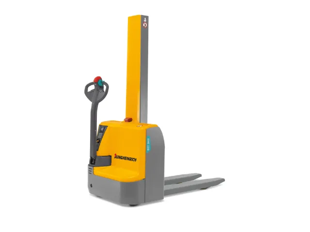 Patín hidráulico Jungheinrich EMC 110, diseñado para realizar de manera más eficiente el transporte de mercancías en entornos logísticos y de almacenamiento. Esta transpaleta tiene una capacidad de carga nominal de 1,000 kg, con una altura de elevación de hasta 2,000 mm, y una velocidad máxima sin carga de 5 km/h gracias a su motor de 24V.