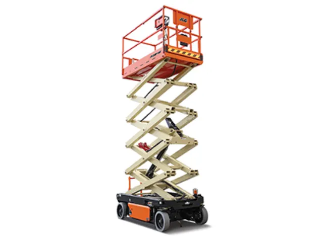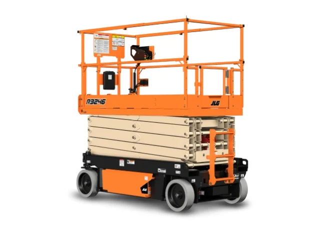La JLG R3246 es una plataforma de tijera eléctrica con altura máxima de trabajo de 11.7 metros y capacidad de carga de 320 kg. Su diseño más ancho ofrece mayor estabilidad, mientras que su estructura compacta permite desplazarse por espacios interiores y exteriores con superficie firme.