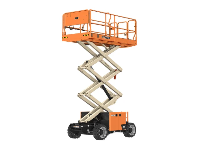 La JLG RT2669 es una plataforma de tijera todoterreno con altura de trabajo de 9.77 metros y capacidad de carga de 680 kg, diseñada para trabajos en exteriores o interiores con superficie irregular.