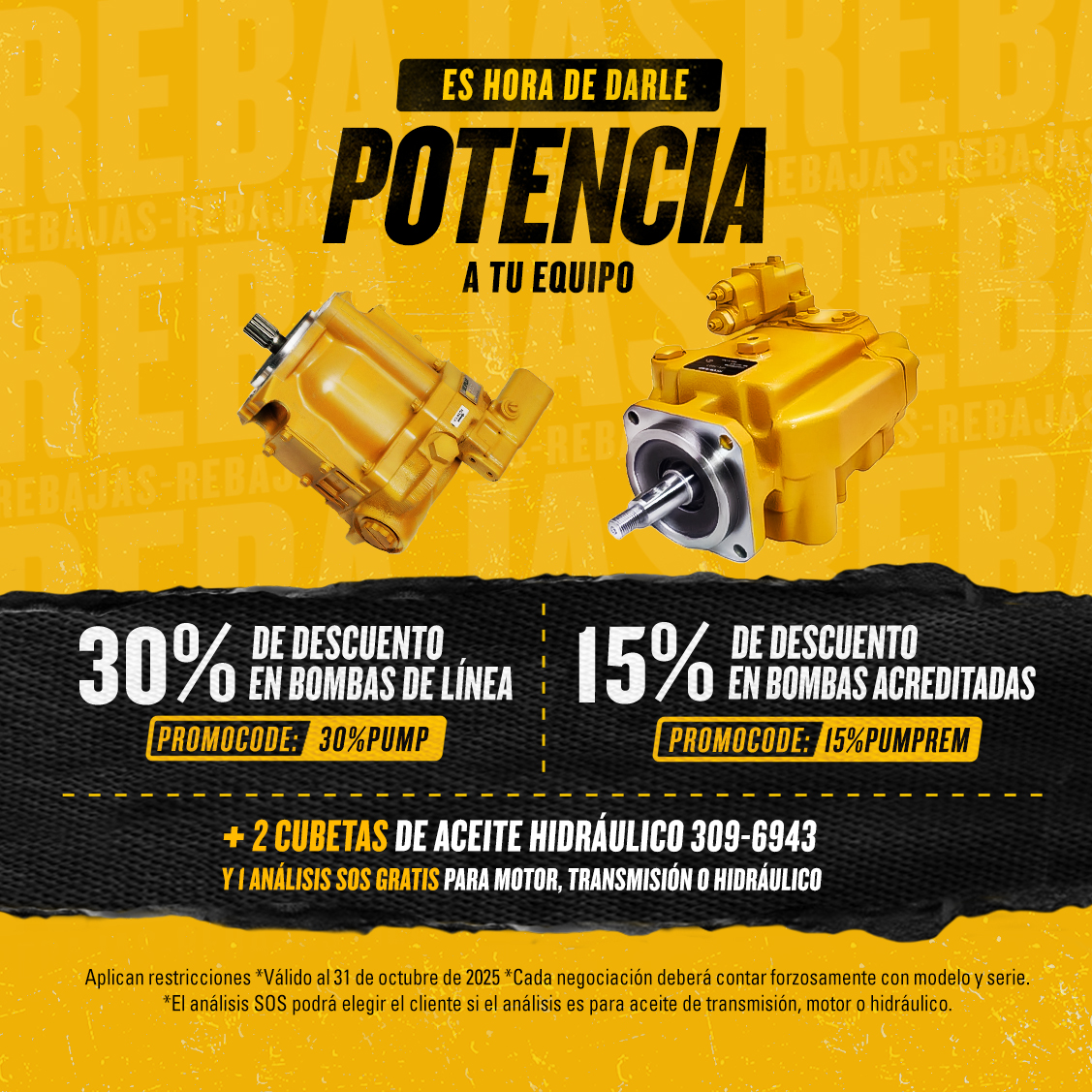 Aprovecha esta promoción especial para mantener tu maquinaria siempre en óptimo rendimiento. Obtén 30% de descuento en bombas de línea (código: 30%PUMP) y 15% en bombas acreditadas (código: 15%PUMPREM) al comprar en parts.cat.com.
